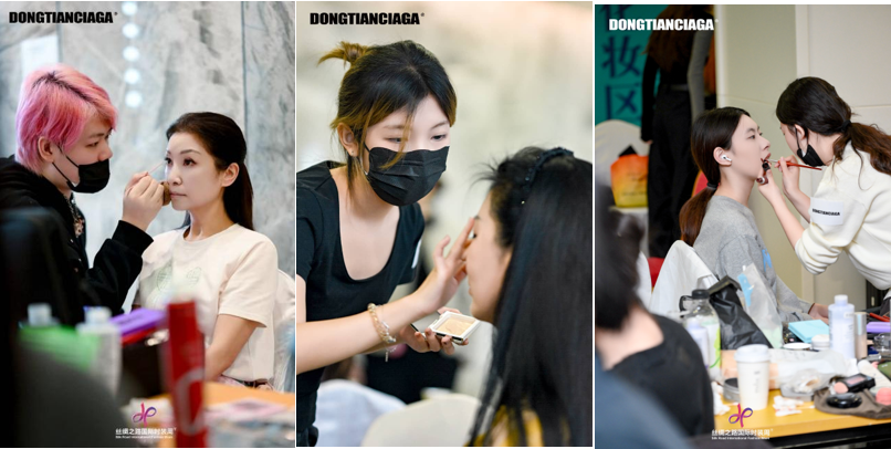在紧张繁忙的时装周后台,DONGTIANCIAGA化妆团队展现了高度专业化的作业流程与默契配合。面对每场秀之间短暂的换场时间,团队通过事前充分准备与模拟演练,制定了精确到分钟的时间管理方案。在《风来了》跨界大秀后台,团队需要在15分钟内为多位模特完成从东盟风情妆容到现代艺术妆容的快速转换,通过高效的团队协作与标准化的操作流程,最终确保了每位模特准时、完美地登场,体现了团队应对高强度工作环境的卓越组织与执行能力。